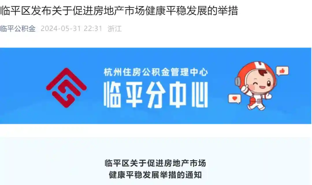 5月31日,浙江省杭州市临平区发布《关于促进房地产市场健康平稳发展举措的通知》,该《通知》自2024年6月1日起实施。