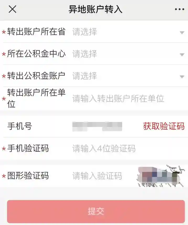 填上转出账户的所在省、公积金中心、公积金账户和所在单位,然后填个手机验证码就可以了。