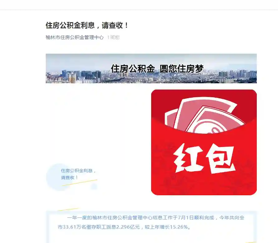榆林市住房公积金管理中心发布消息称,一年一度的榆林市住房公积金管理中心结息工作于7月1日顺利完成,今年共向全市33.61万名缴存职工派息2.296亿元,较上年增长15.26%。