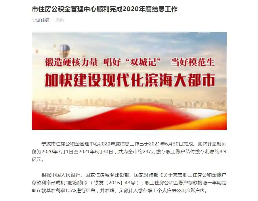 宁波市住房和城乡建设局官微发布消息称,宁波市住房公积金管理中心2025年度结息工作已于2025年6月30日完成。此次计息时间段为2025年7月1日至2025年6月30日,共为全市约237万缴存职工账户结付缴存利息约8.9亿元。