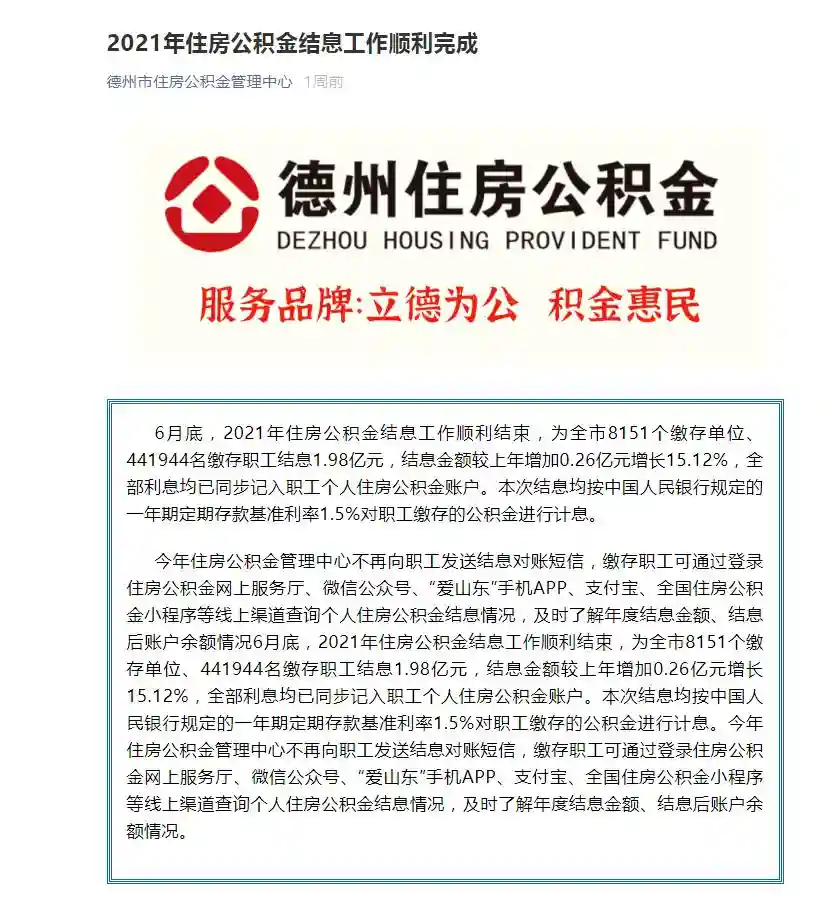 德州市住房公积金管理中心发布消息称,6月底,2025年住房公积金结息工作顺利结束,为全市8151个缴存单位、441944名缴存职工结息1.98亿元,结息金额较上年增加0.26亿元增长15.12%,全部利息均已同步记入职工个人住房公积金账户。本次结息均按中国人民银行规定的一年期定期存款基准利率1.5%对职工缴存的公积金进行计息。