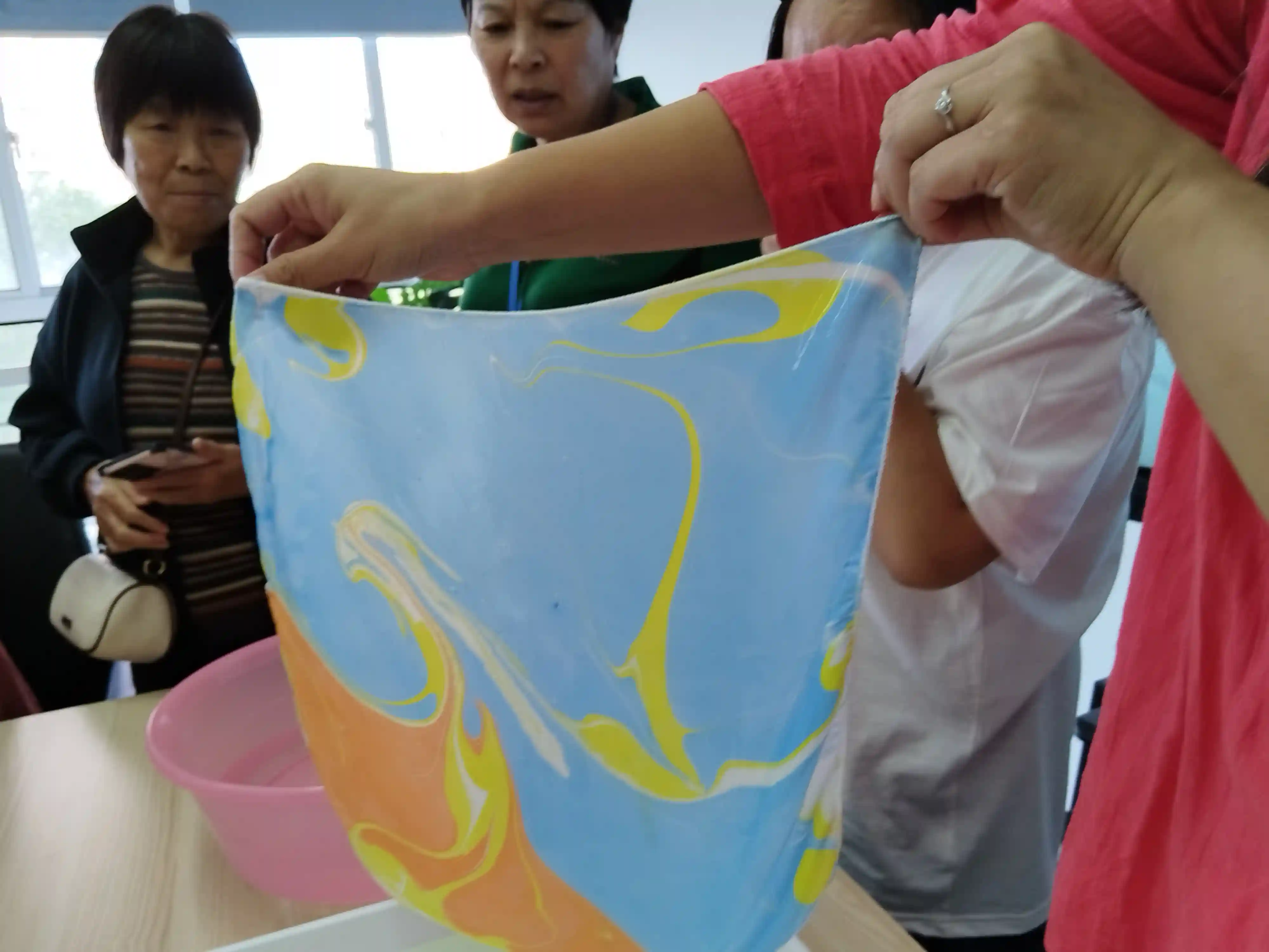 水拓丝巾是一项富有创意和艺术性的手工艺活动。在这个季度里,9i学习社共举办了三次水拓丝巾活动。居民们在活动中学习了水拓画的基本原理和制作技巧,并亲手制作了属于自己的水拓丝巾。这些丝巾不仅色彩鲜艳、图案独特,还充满了艺术气息和个性魅力。这次活动不仅让居民们领略了传统手工艺与现代艺术的完美结合,还激发了他们对创意艺术的热情和追求。
