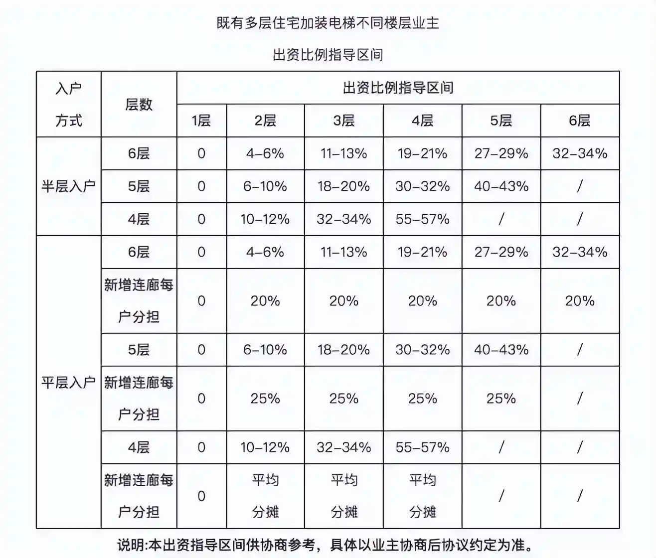 对于入户方式为平层入户的6层老楼,如果没有新增连廊,各层业主出资的指导比例区间与半层入户的相同。如果有新增连廊的话,除了一层业主外,其他楼层的业主将均摊出资费用。与之类似,对于6层以下的老楼,随着楼层下降,每个楼层的出资比例将依次减少,一层业主不需要出资。