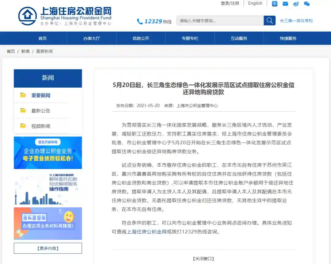 ▍近日,上海市公积金管理中心发布消息:自5月20日起,在长三角生态绿色一体化发展示范区试点提取住房公积金偿还异地购房贷款业务。