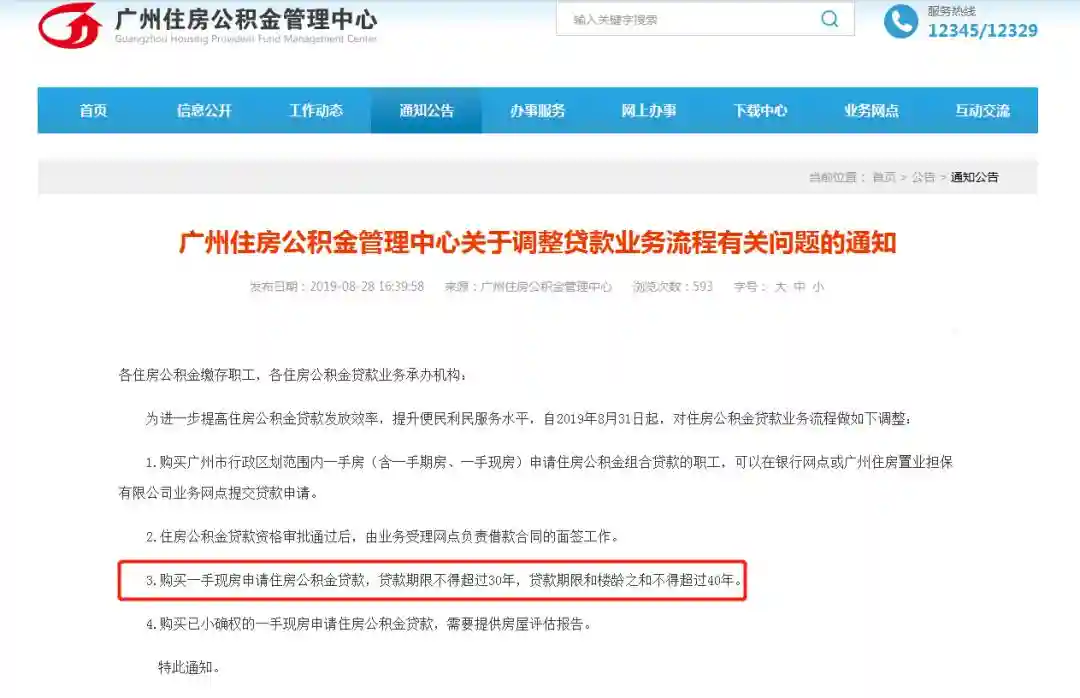 8月31日,广州住房公积金管理中心发布《关于调整贷款业务流程有关问题的通知》提出,购买一手现房申请住房公积金贷款,贷款期限不得超过30年,贷款期限和楼龄之和不得超过40年。