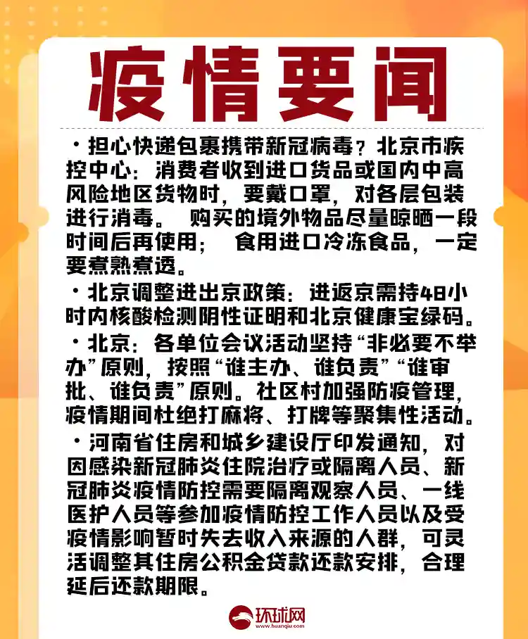 1.担心快递包裹携带新冠病毒?北京市疾控中心:消费者收到进口货品或国内中高风险地区货物时,要戴口罩,对各层包装进行消毒。购买的境外物品尽量晾晒一段时间后再使用;食用进口冷冻食品,一定要煮熟煮透。