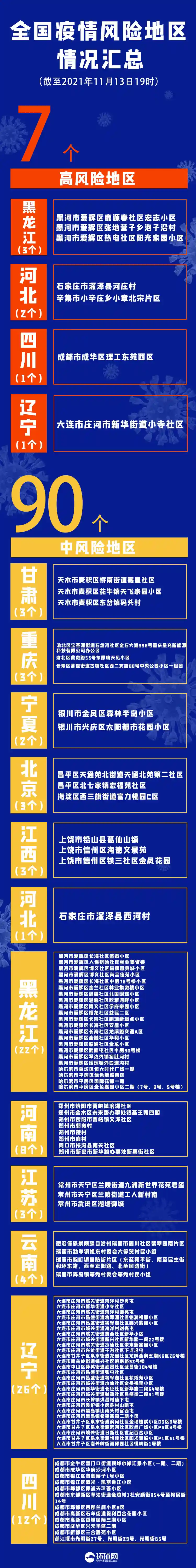 11月12日19时至11月13日19时,新增1个高风险地区,在辽宁大连市;新增3个中风险地区,均在辽宁大连市。此外,将山东日照市五莲县洪凝街道学府壹号小区调整为低风险地区。目前全国共有7个高风险地区,90个中风险地区,分布在北京、甘肃、宁夏、黑龙江、江西、河北、四川、河南、江苏、重庆、辽宁和云南12地。
